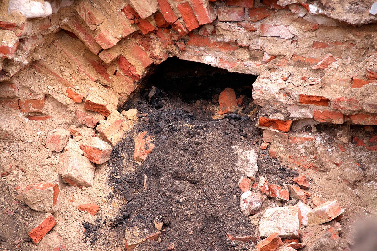 По какой-то причине, по окончании работ, образовавшийся ход завалили обломками конструкций здания и грунтом. Похоже, исследовать его не собираются. Если же там тоже будут прокладывать траншею, то перекрытию могут быть уничтожены и помещения засыплет землей.