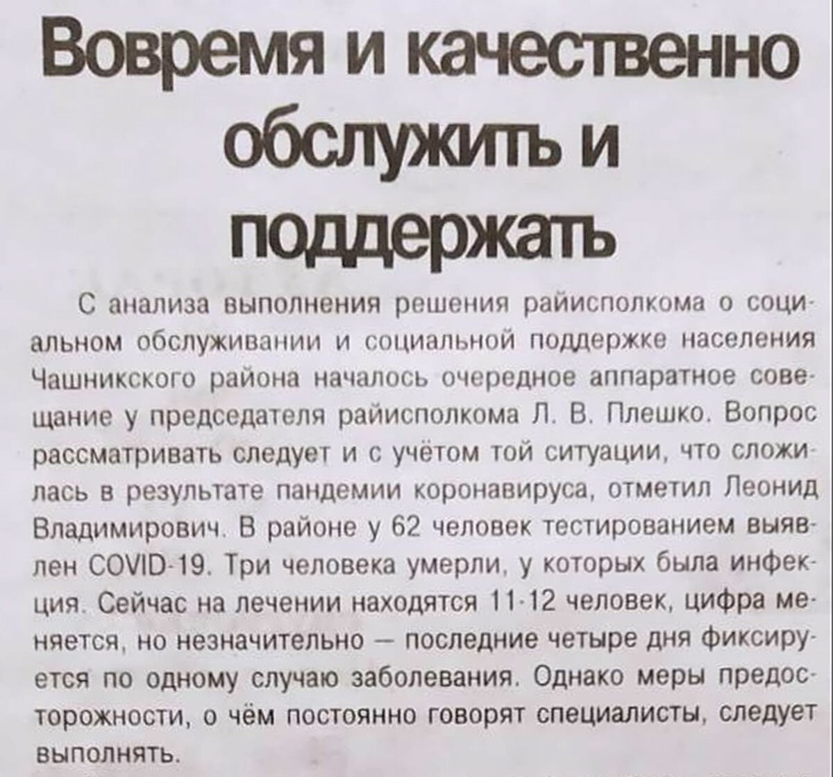 Отметим, что информация об эпидемиологической ситуации в регионе была опубликована только в бумажном издании газеты в заметке с названием «Вовремя и качественно обслужить и поддержать» из №42 за 26 мая. На сайте «Чырвонага прамня» этого материала нет.