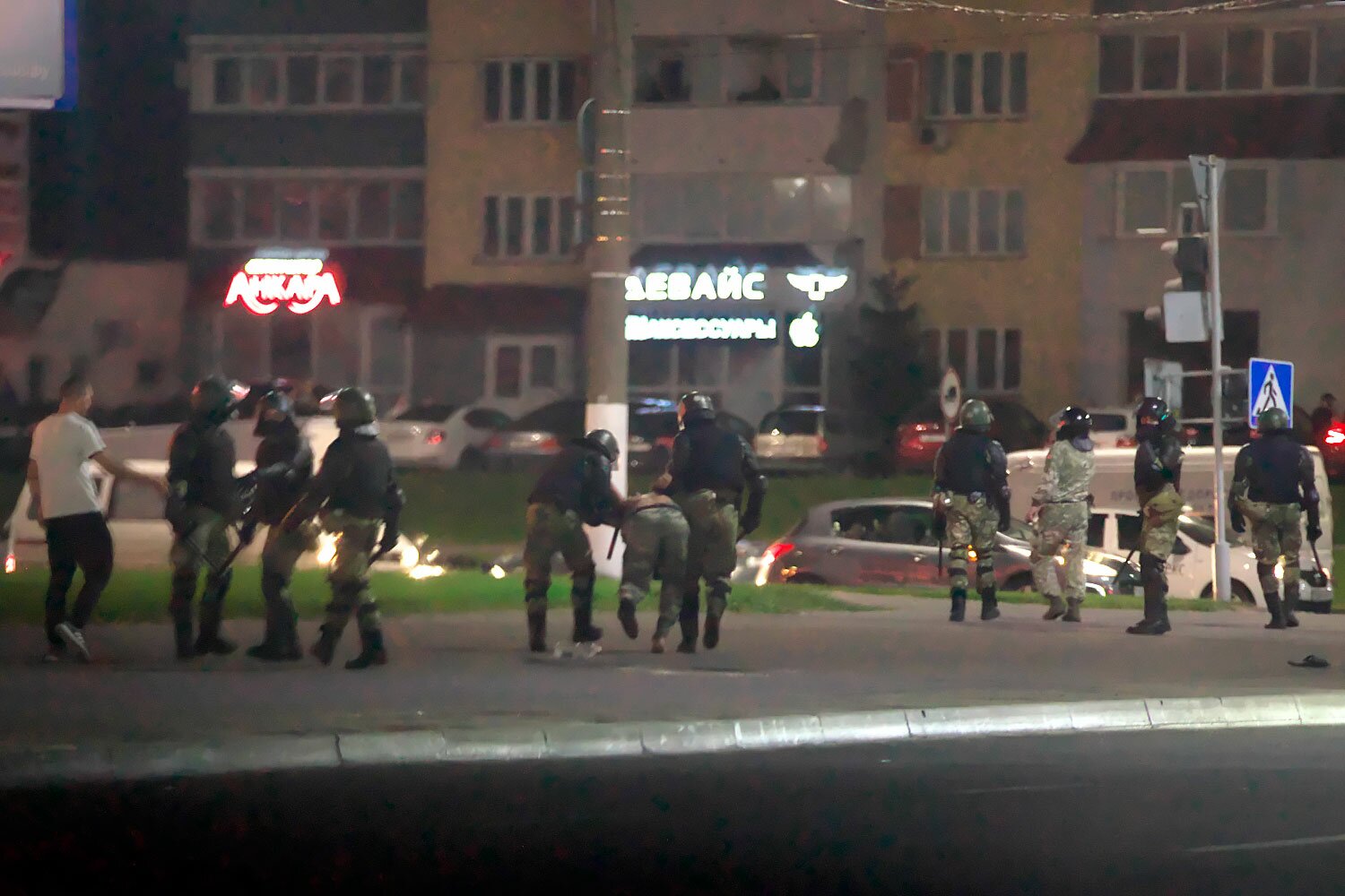 На улицах Витебска силовики в защитной экипировке задерживают людей. Движение транспорта по части улиц перекрыто