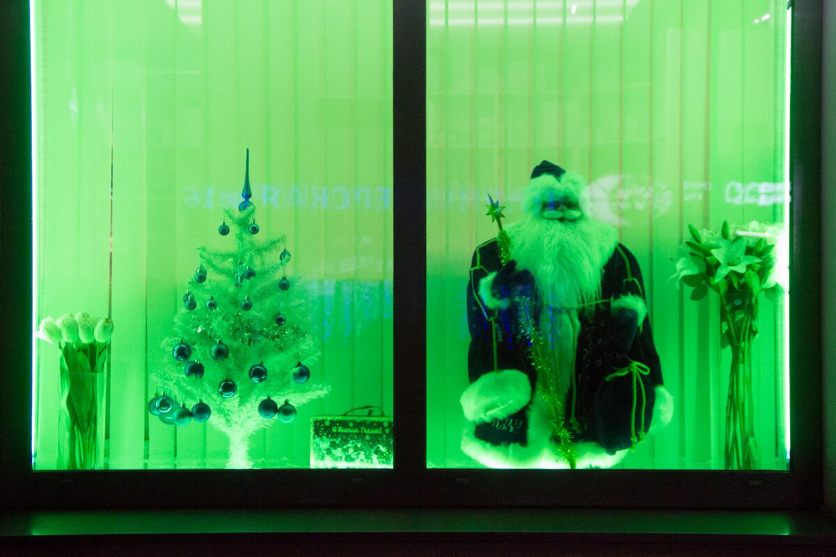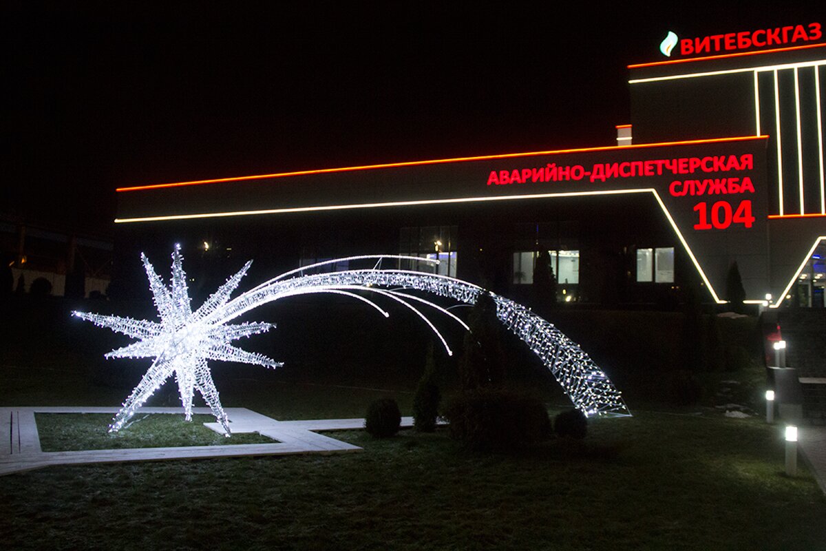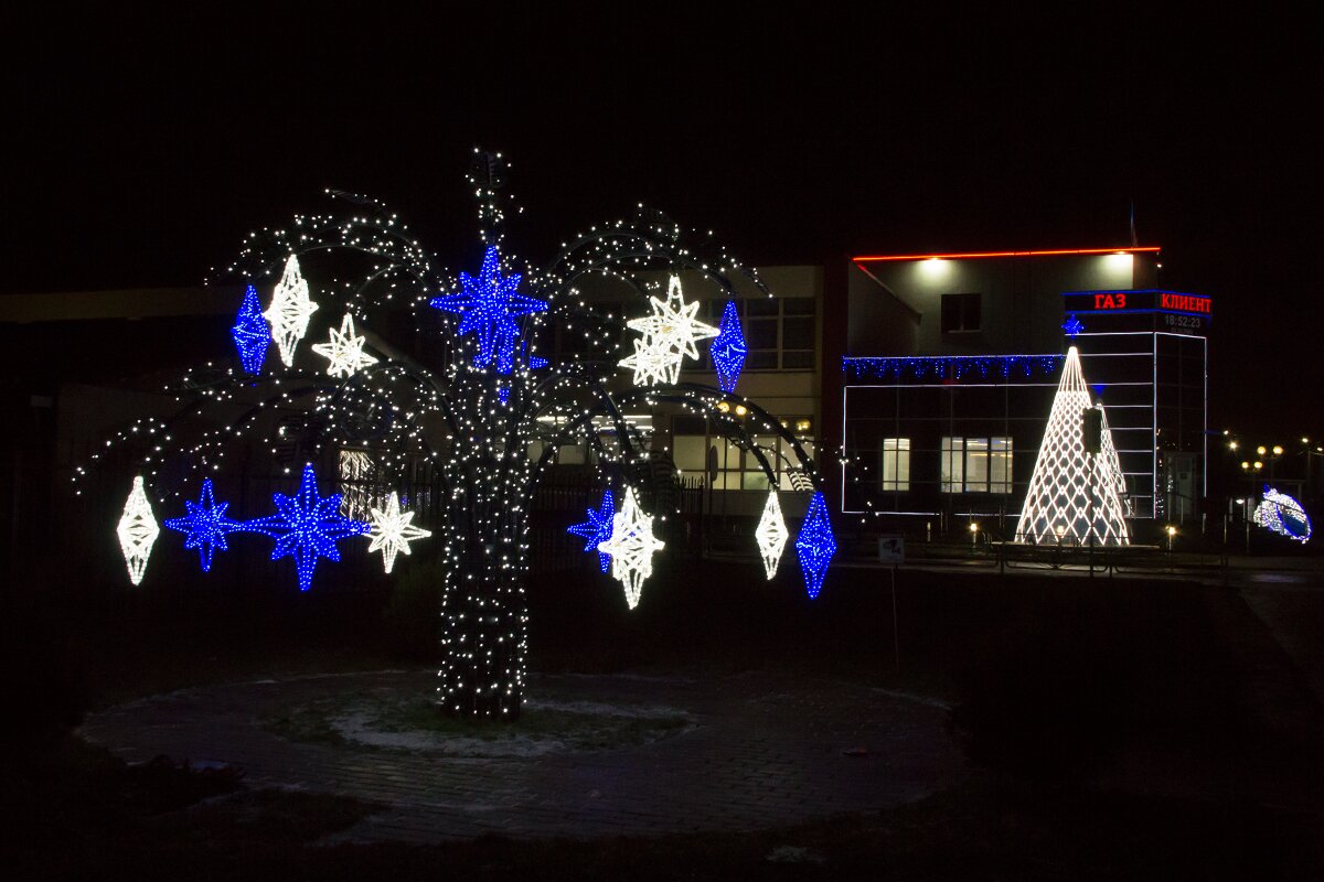 Огнями мерцают окна и входы магазинов, кафе, ресторанов. Предприятия и организации также постарались принарядить свои здания к празднику.