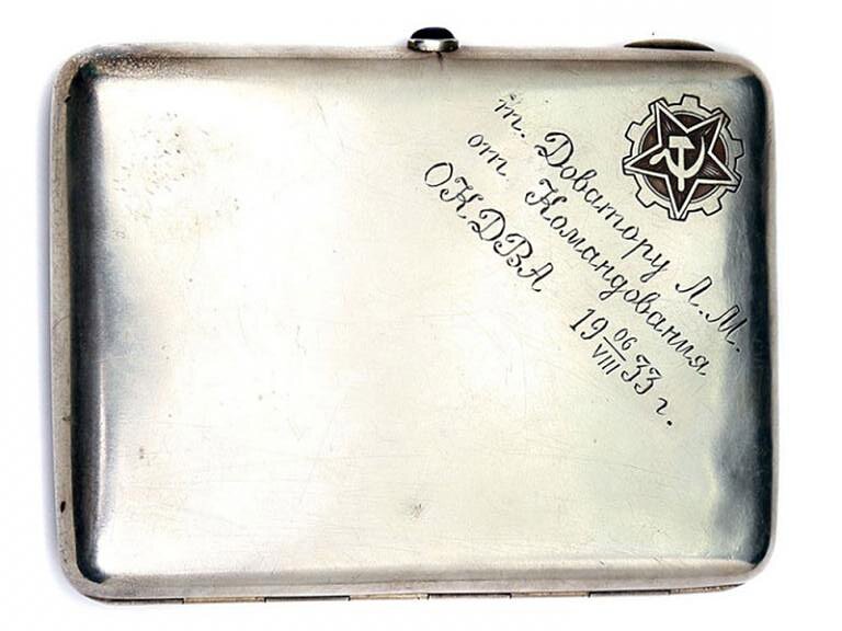 Однако, как оказывается, командование и ранее отмечало белорусского кавалериста. Согласно гравировке на портсигаре, он был вручен т. Доватору Л.М. от командования ОКВДА 6 августа 1933 года. В это время Доватор служил командиром взвода 27-го кавполка в составе Особой Краснознамённой Дальневосточной армии. Портсигар изготовлен из серебра 875 пробы, на нем изображен дозор из трех красных конников. В углу рядом с гравировкой нанесена красноармейская звезда, наложенная на шестеренку, как и на нагрудном знаке Осоавиахим «Бойцу ОКДВА». Чем отличился комвзвода Лев Доватор, заслужив эту награду, неизвестно.