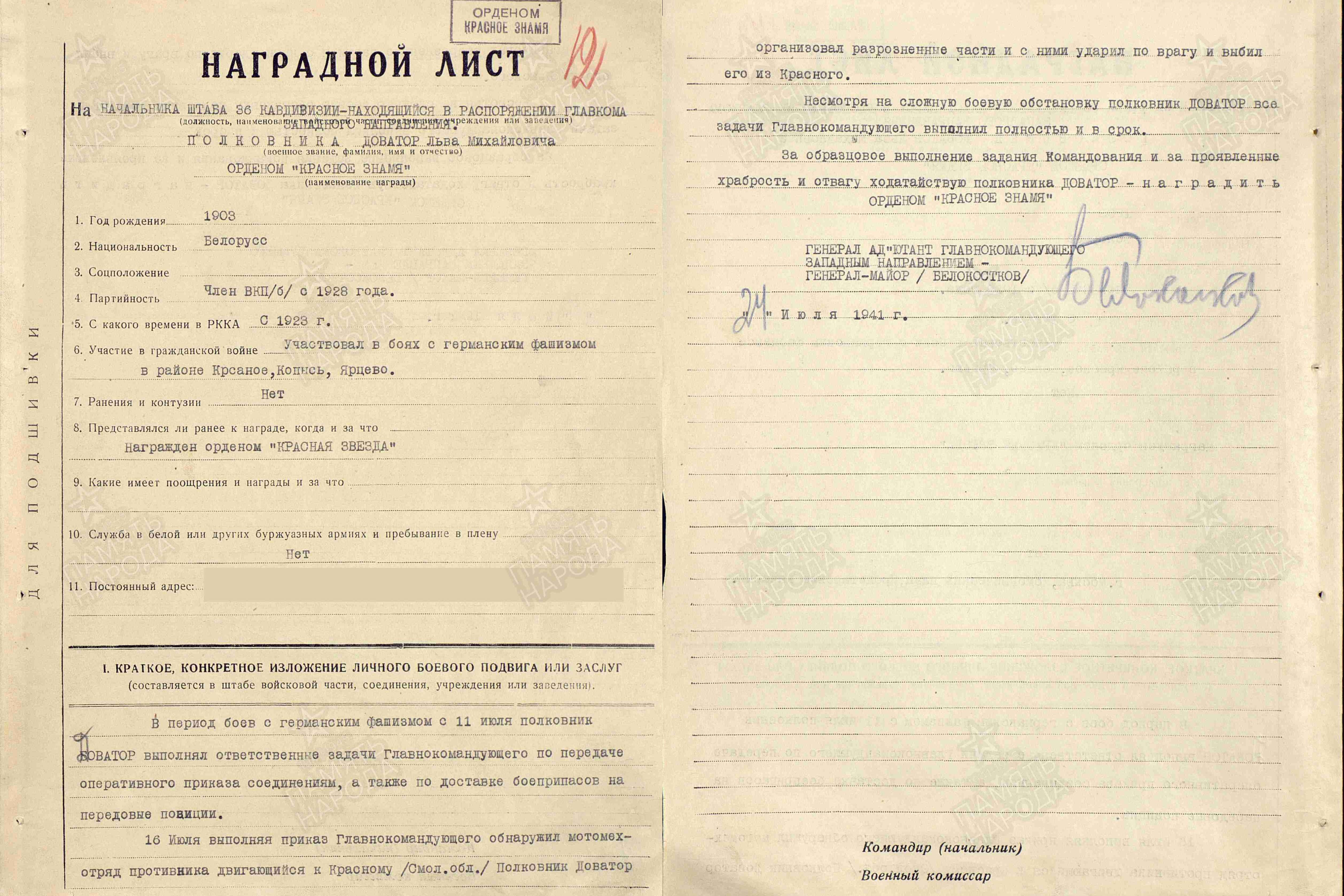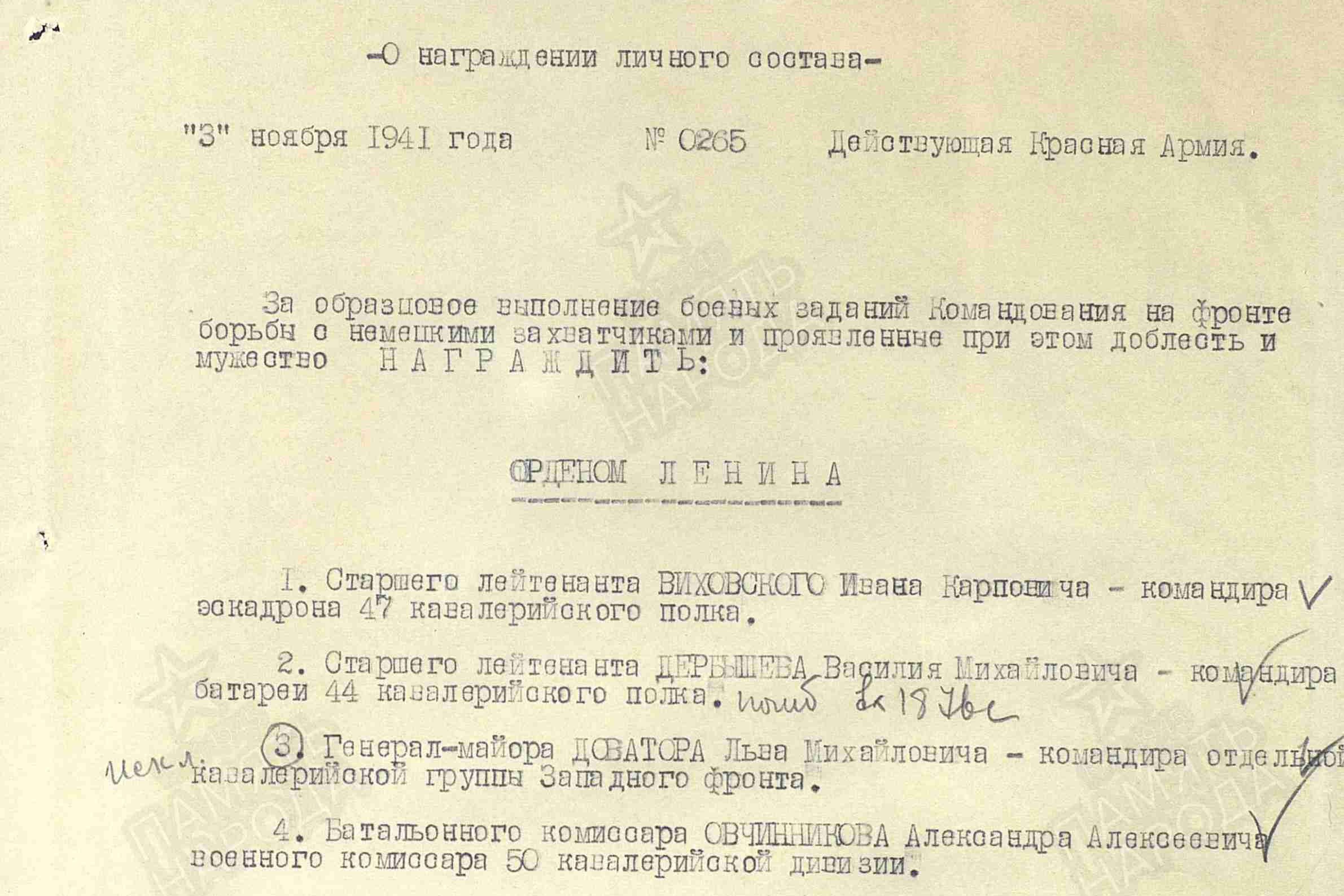Точная дата награждения орденом Красной Звезды и подвиг, за который его вручили красному коннику неизвестны, однако эта награда упоминается в наградном листе на орден Красного Знамени от 24 июля 1941 года, т.е. ее должны были вручить раньше. Что касается количества орденов Ленина, то один из них идет в комплекте с медалью «Золотая звезда», а вот первым орденом Ленина Доватора наградили согласно приказу по войскам Западного фронта от 3 ноября 1941 года, но рядом с его именем стоит пометка «искл.», что можно расшифровать, как «исключить». Также уже посмертно в 1945 году Доватор был награжден медалью «За оборону Москвы».