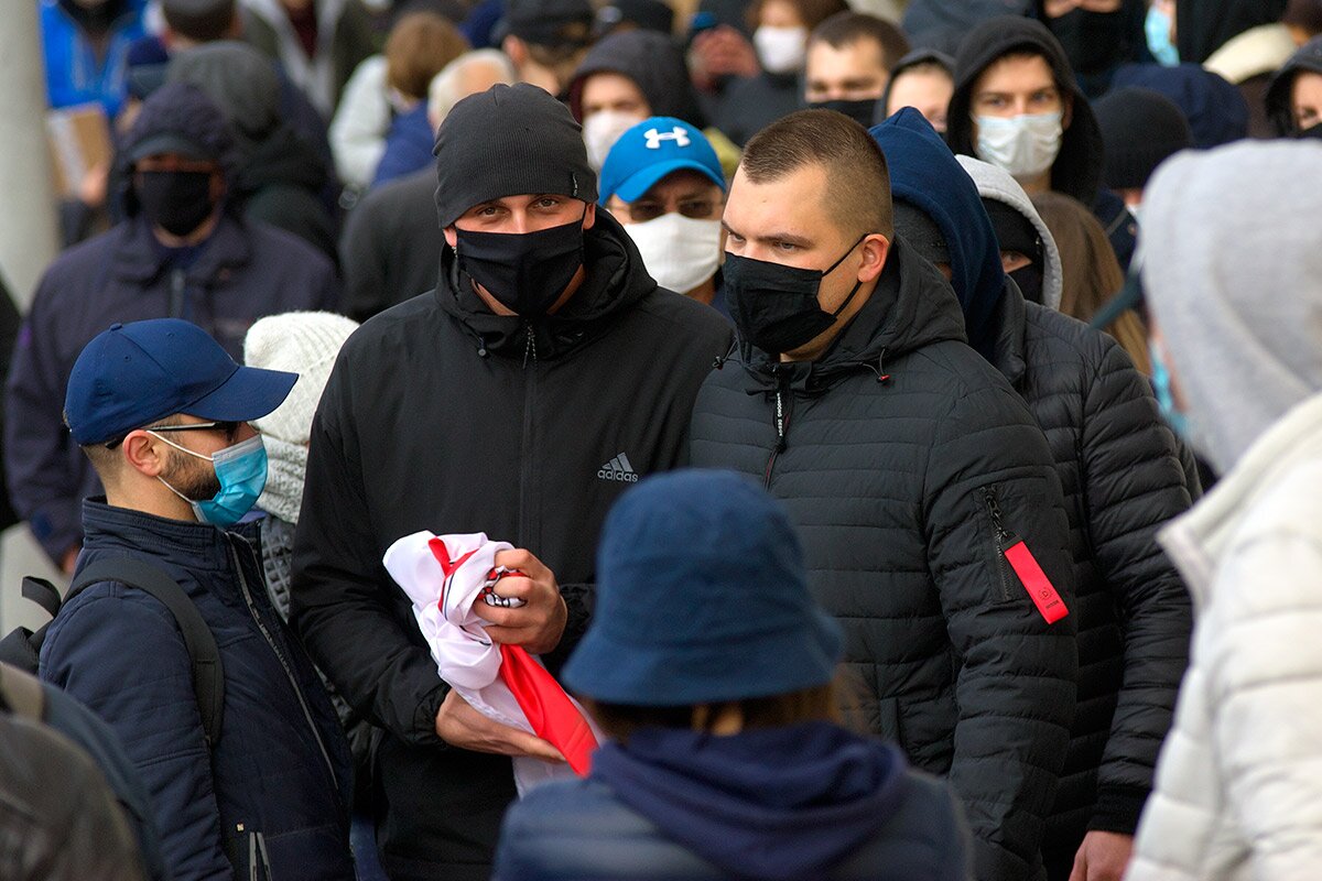 Уже тогда, как видно из фоторепортажа «ННВ», в колонну мирных демонстрантов вторгались неизвестные в гражданской одежде, которые отнимали у протестующих символику.