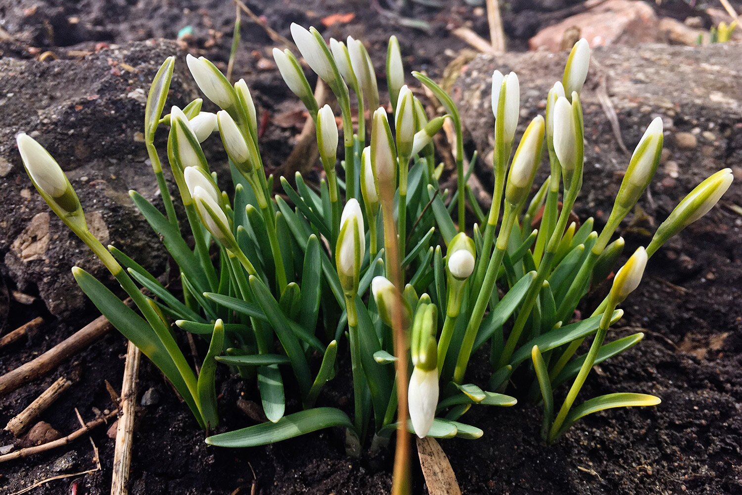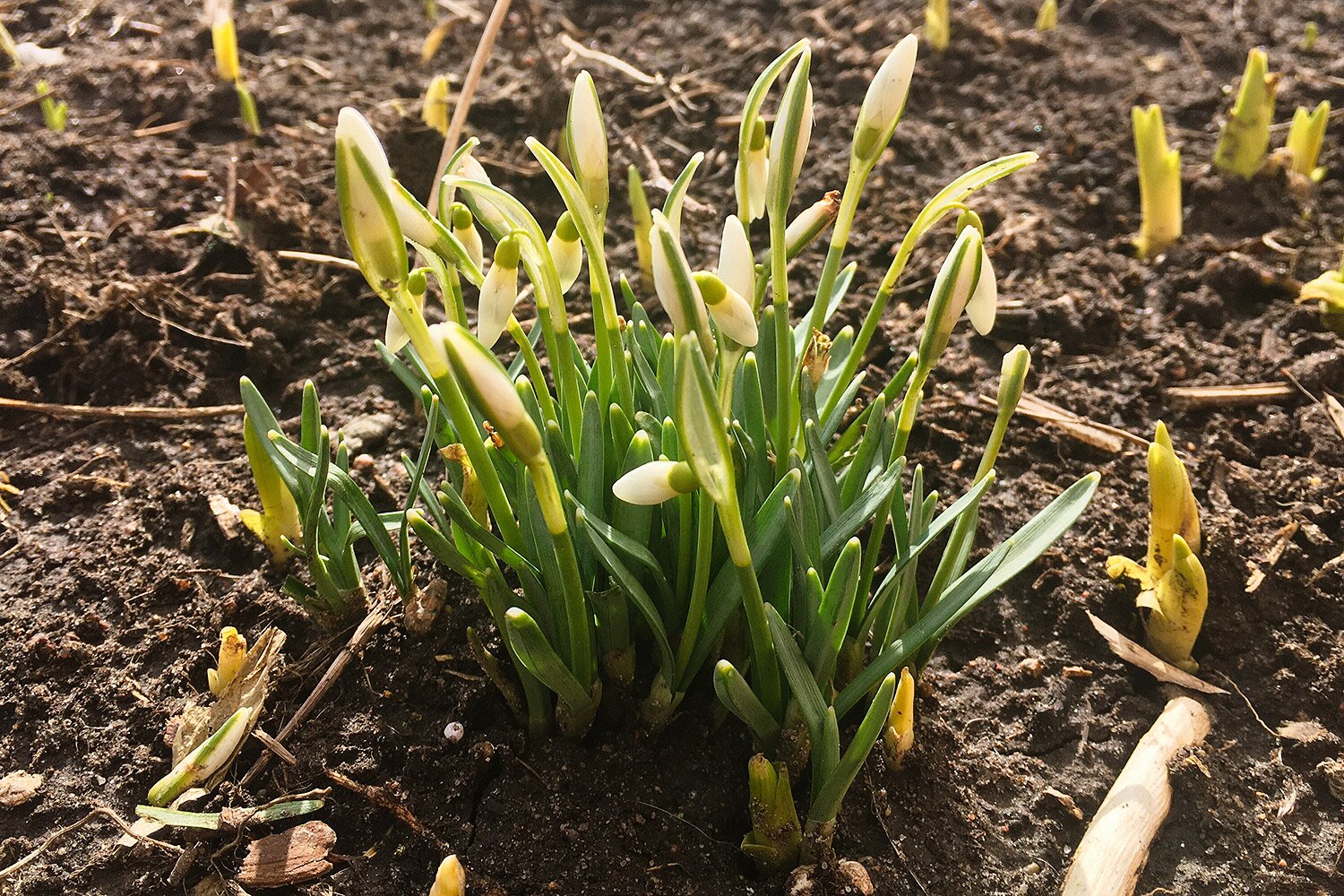 На клумбах вдоль проспекта Фрунзе начали распускаться галантусы, эти белые цветки родом с Кавказа садоводы-любители называют у нас подснежниками.