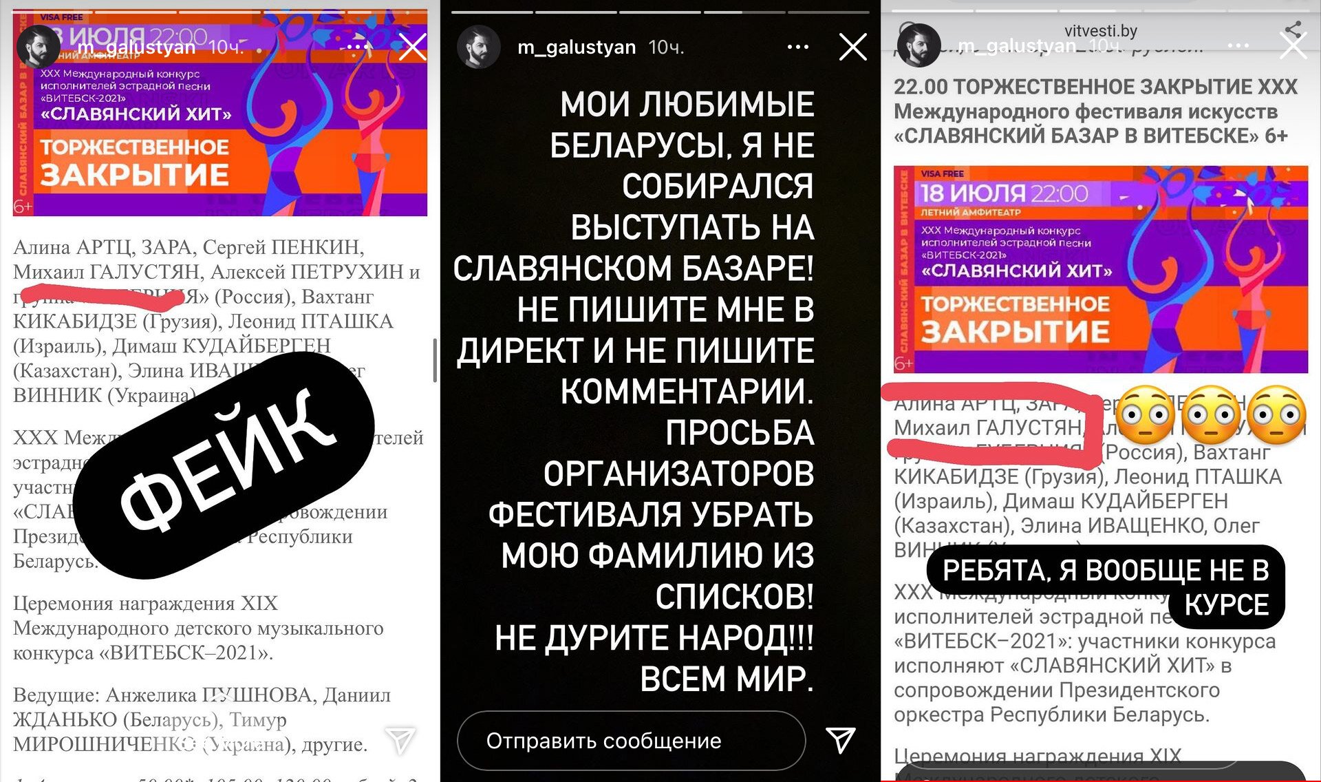 — Мои любимые беларусы. Я не собирался выступать на Славянском базаре! Не пишите мне в директ и не пишите комментарии. Просьба организаторов фестиваля убрать мою фамилию из списков! Не дурите народ!!! Всем мир, — написал Михаил в сторис своего instagram.
