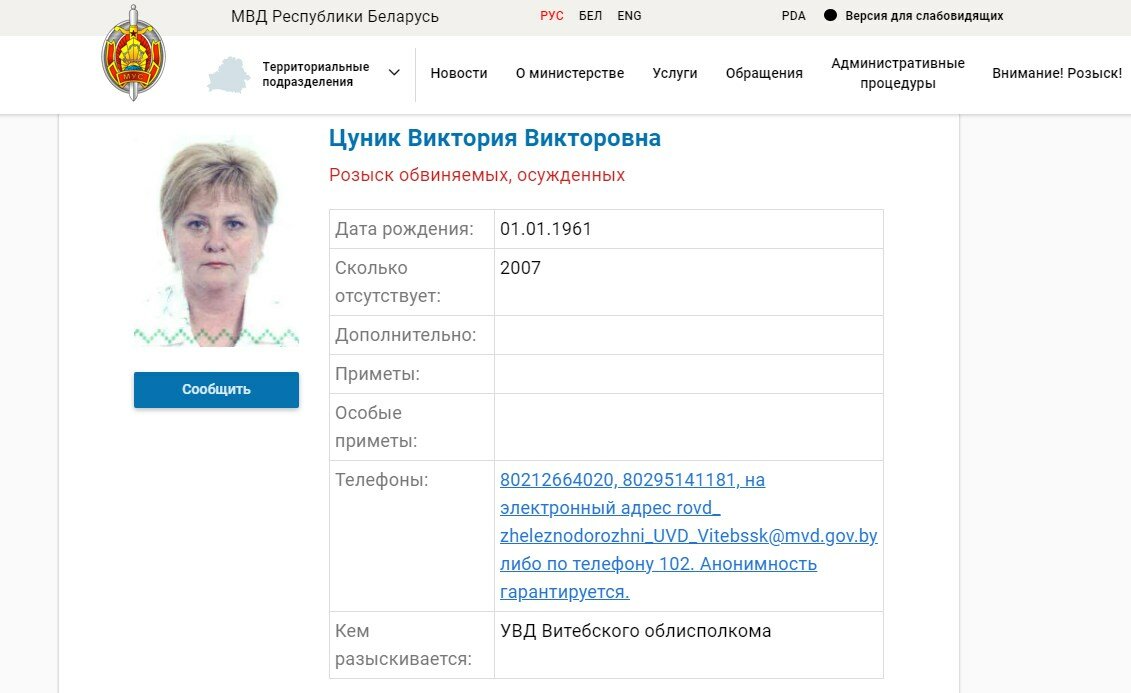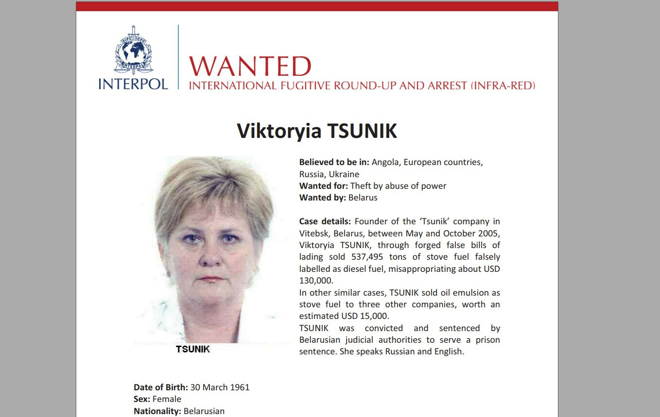 В ориентировке «Интерпола» на Викторию Цуник (Viktoryia Tsunik) (имеется в распоряжении редакции «ННВ») говорится, что, будучи учредителем компании «Цуник» в Витебске, с мая по октябрь 2005 года витеблянка через поддельные накладные продала 537,495 тонн печного топлива, ложно маркированного как дизельное топливо. В результате она присвоила около 130 000 долларов США. В других подобных случаях Цуник продала нефтяную эмульсию в качестве печного топлива трем другим компаниям на сумму около 15 000 долларов США.