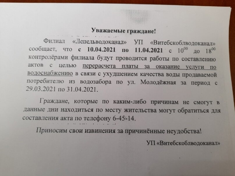 В городском поселке появились объявления о том, что 10 и 11 апреля контролеры филиала «Лепельводоканал» УП «Витебскооблводоканал» будут составлять акты для перерасчета оплаты услуг по водоснабжению из-за ухудшения качества подаваемой воды в период с 29 марта по 31 апреля. Фото этого объявления вчера опубликовали в паблике «Типичные Бешенковичи».