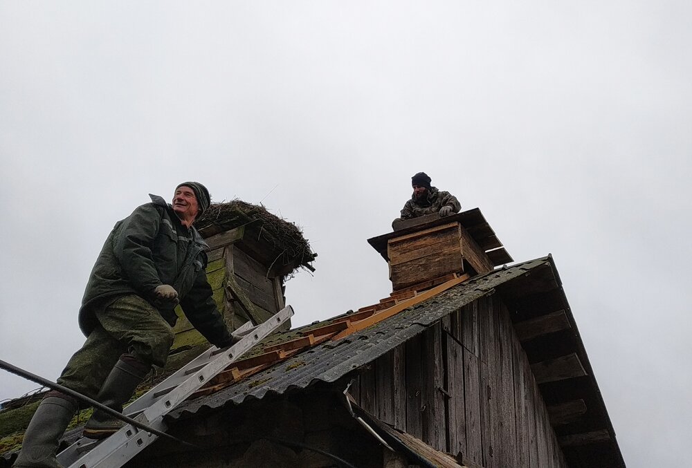 И вот 20 октября, когда закончился гнездовой период и птицы улетели на юг, сотрудники научного отдела Березинского биосферного заповедника с участием работников лесной охраны Крайцевского лесничества сняли с конька старую заслуженную буслянку и заменили ее новым искусственным гнездовьем.