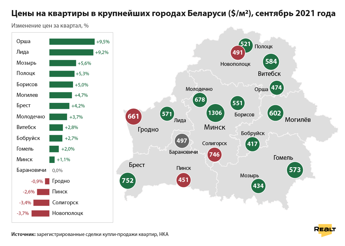 Купить квартиру в Витебске в сентябре можно было в среднем за 584 $/кв. м, что на 3% выше, чем кварталом ранее. В Полоцке за тот же период «квадрат» вырос в цене на 5% — до 521 $. В Орше квартиры за три месяца подорожали сразу на 10% — до 474 $/кв. м.