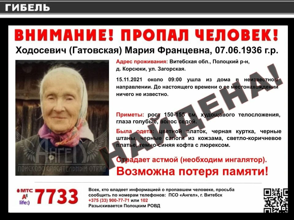 25 ноября стало известно, что пенсионерка погибла, об этом сообщили на странице ПСО «Ангел» в Facebook. Тело Марии Ходосевич обнаружили сотрудники Полоцкого РОВД.